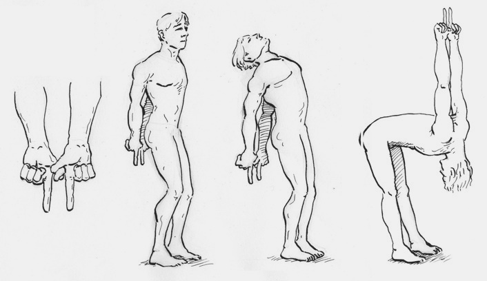 Notes : Cet exercice peut sembler trop « facile » pour certains (c’était mon cas), une attention détaillée permettra de prendre conscience de l’existence de petites tensions (aux hanches par exemple). Une variante consiste à placer les mains sur ses genoux plutôt que sur ses épaules.