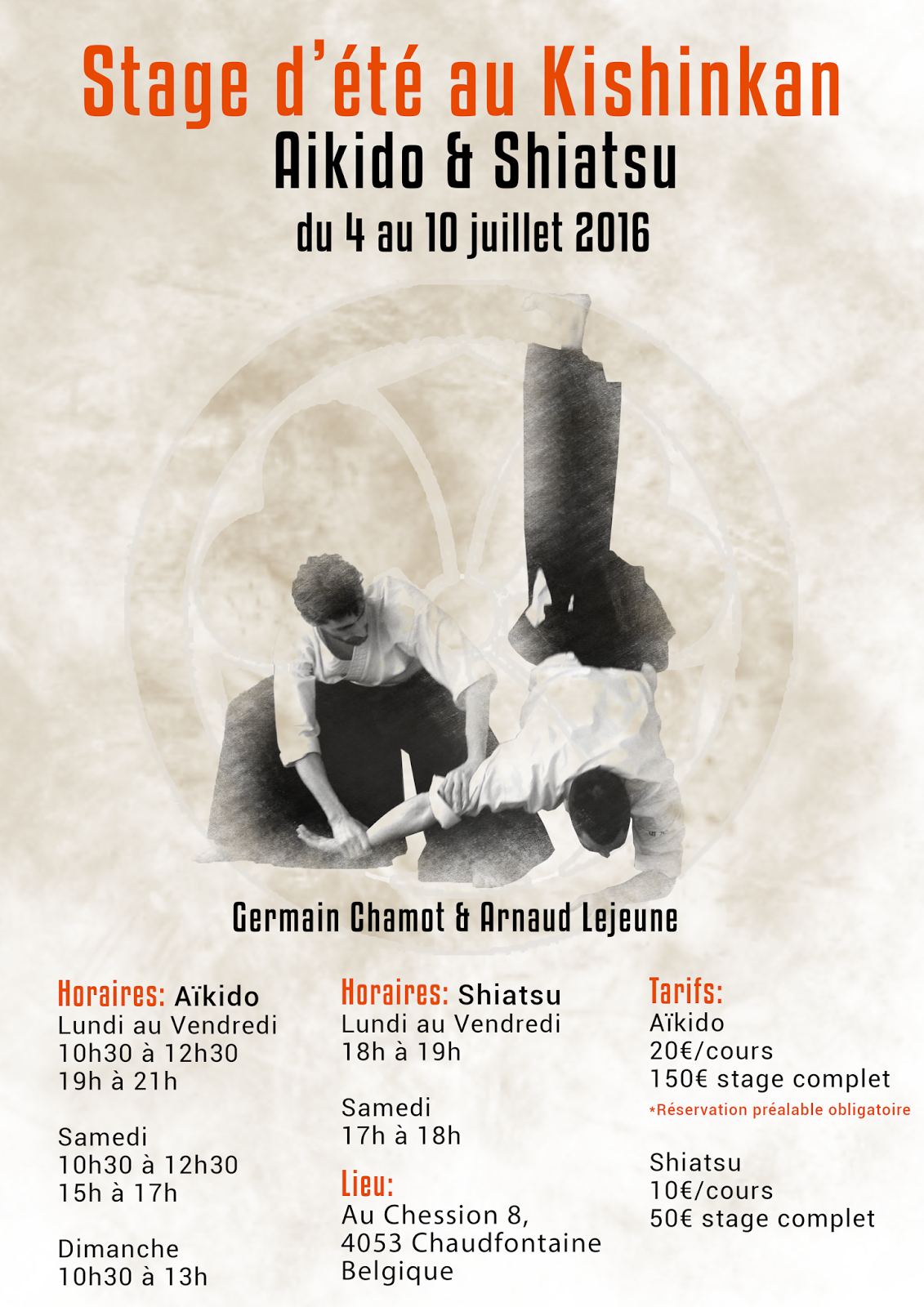 L’été 2016 sera bien rempli puisque j’animerai 3 stages en France et à l’étranger. Le premier avec Arnaud Lejeune à Liège (Belgique), le deuxième avec mon père, Jean-Marc Chamot, à St-Félicien (Ardèche) et le troisième avec Léo Tamaki à Monaco.