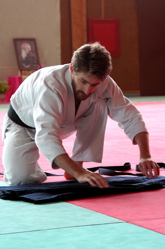En Aïkido, la situation est quelque peu différente puisque le débutant ne porte généralement pas de Hakama. C’est Me Tamura qui a proposé de procéder ainsi. En effet, dans le Japon d’après-guerre, cela représentait un investissement financier que peu de pratiquants pouvaient se permettre avant d’être véritablement engagés dans la pratique de l’Aïkido. La situation ayant changé, certaines écoles proposent à leurs adeptes de porter le Hakama dès les premiers jours de pratique.