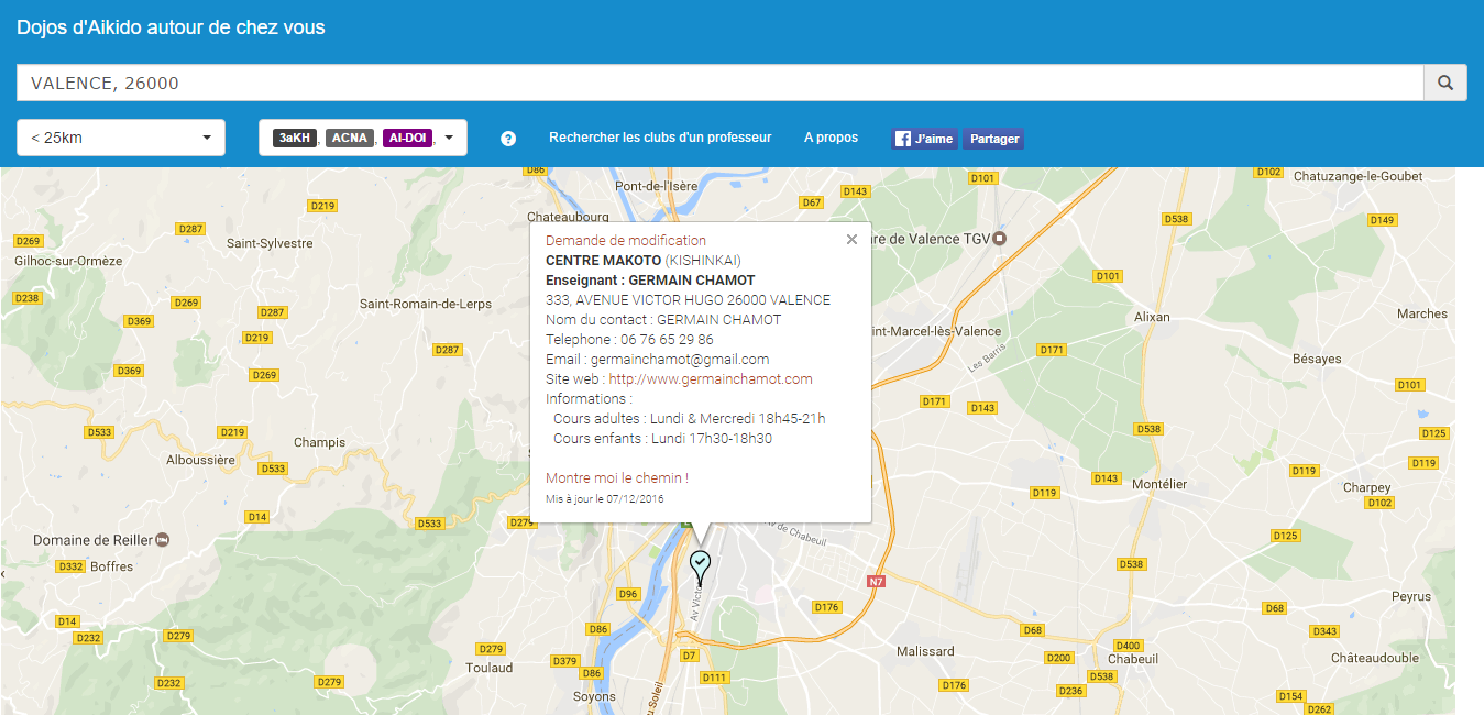 L’interface est simple et très fonctionnelle. Il est possible de mettre à jour les informations concernant son dojo. On peut également rechercher les dojos présents dans un rayon de kilométrique autour de son domicile ou de son lieu de travail.