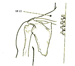 Le point Vésicule Biliaire n°21, alias VB21, encore connu sous le doux nom de « puits de l’épaule », est situé à mi-distance entre la septième cervicale et l’acromion, au milieu du trapèze. Ce point, souvent douloureux à la pression, est employé pour des tensions dans les épaules et la nuque. Il est déconseillé de l’employer en cas de grossesse puisqu’il est considéré comme abortif étant donné qu’il stimule l’ouverture du col de l’utérus…
