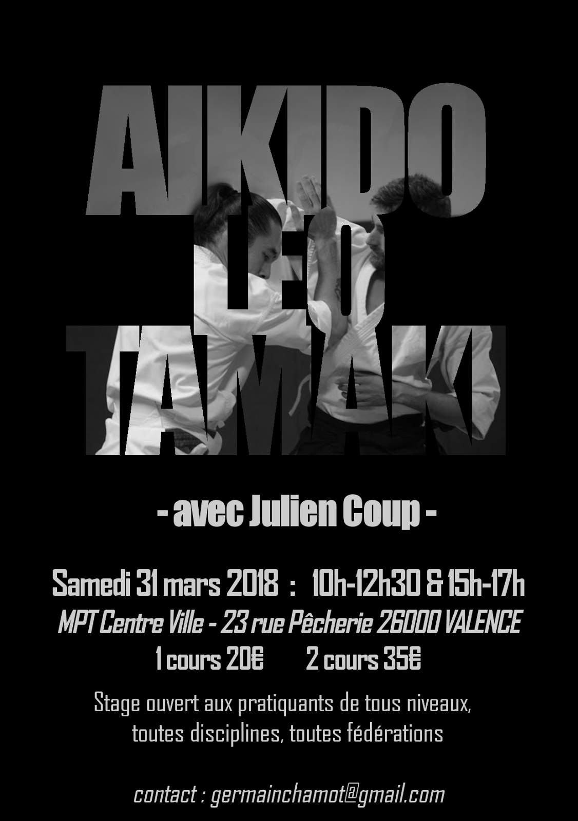 Léo Tamaki sera de retour à Valence pour un stage d’une journée, le samedi 31 mars 2018. Il sera exceptionnellement accompagné de Julien Coup, pilier de l’école Kishinkaï.