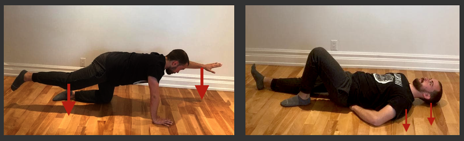 The Bird Dog :On se place à quatre pattes en essayant de trouver un position neutre de la colonne. L’objectif va ensuite être de tendre une jambe et le bras du côté opposé en même temps, sans perdre la forme du buste trouvée précédemment. L’envie naturelle serait de laisser la colonne vriller, attirée par la jambe et le bras levés. C’est ce contre quoi on essaie de se prémunir.